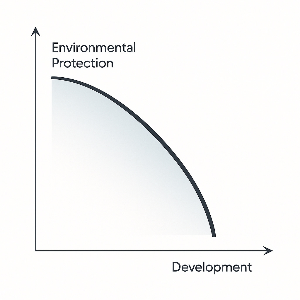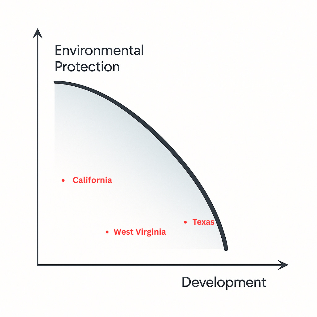 Fortunately, unlike federal permitting policy, which requires a one-size-fits-all approach, states can tailor their policies to their environment. I find it useful to think about the tradeoffs states have to make in terms of a Pareto curve. A Pareto curve is a simple concept from economics that shows the tradeoff between competing objectives, in this case, between environmental protection and development.